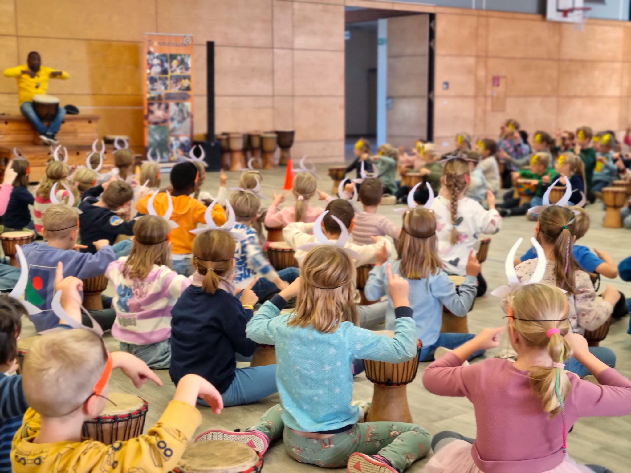 Vom 29. September bis 1. Oktober 2025 erlebten alle Kinder der Grundschule Ostenland ein ganz besonderes musikalisches Abenteuer: das Projekt „Trommelzauber“ mit DJ Fofo. Gemeinsam begaben sich die Schüler*innen auf eine fantasievolle Reise nach Tamborena. Zu mitreißenden Rhythmen wurde getrommelt, getanzt und gesungen – mit viel Begeisterung und Energie.