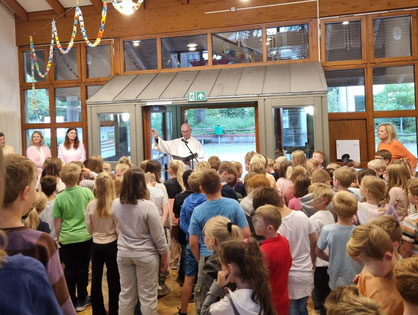 Am Montag der zweiten Schulwoche starteten alle Schülerinnen und Schüler mit einem Segen ins neue Schuljahr. Herr Laskowski spendete den Segen und wünschte allen Kindern, MitarbeiterInnen und Kolleginnen ein gutes und fröhliches Schuljahr 2025/26, gut behütet mit dem Segen Gottes.