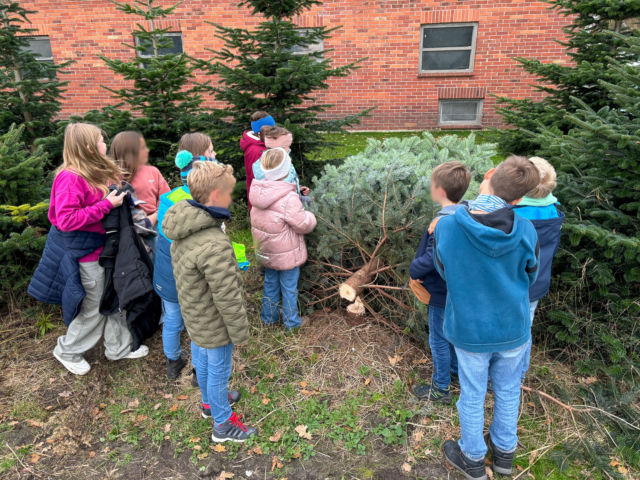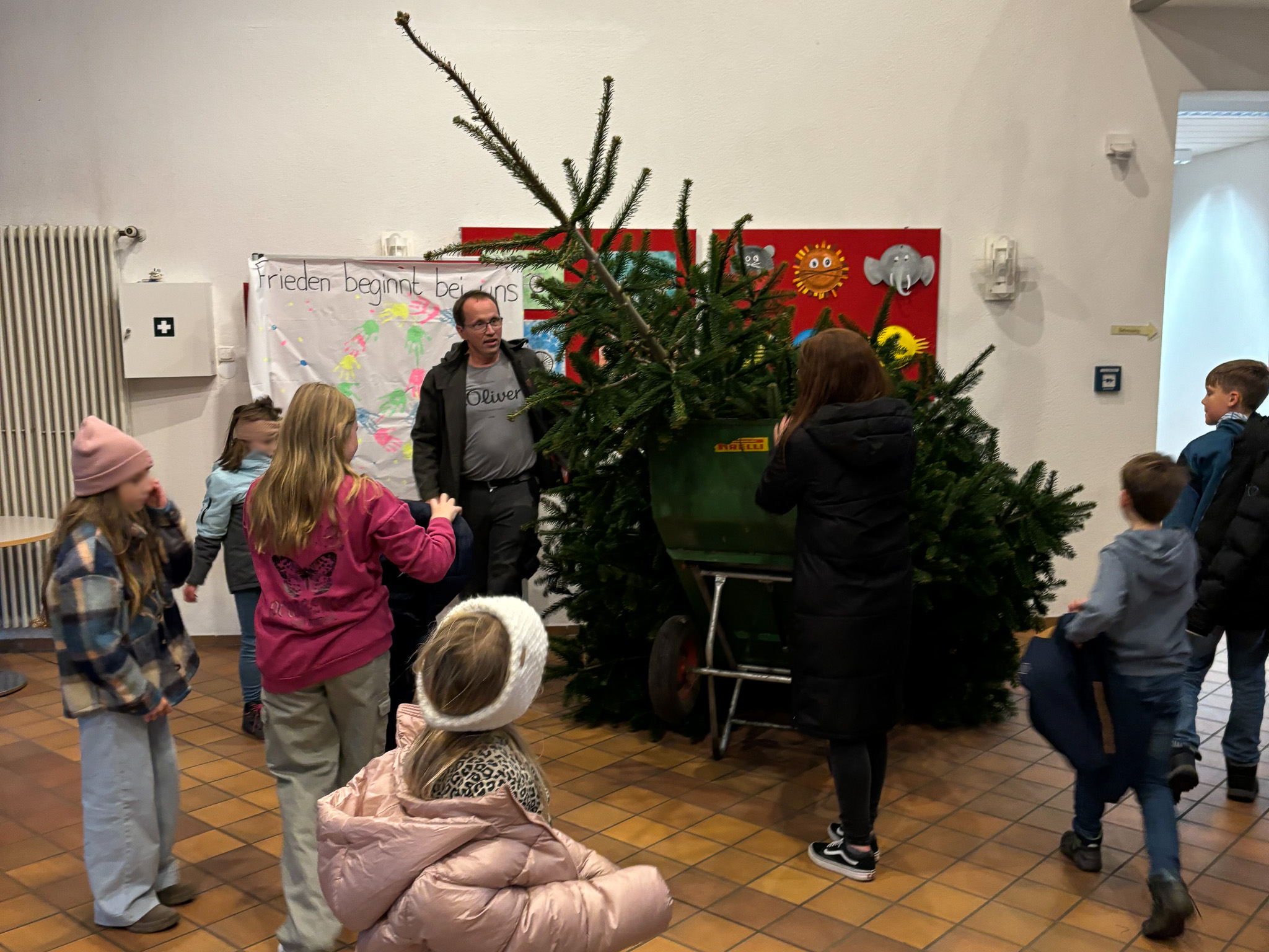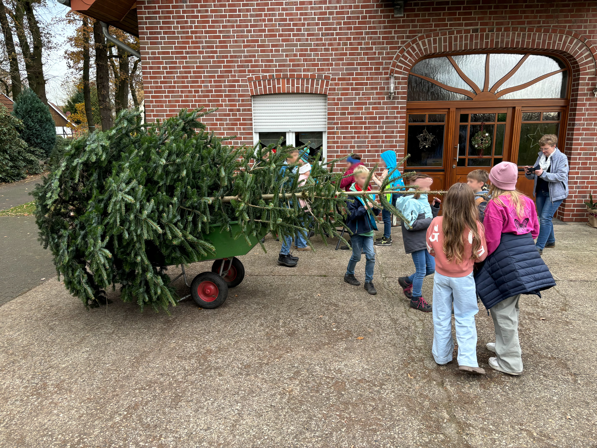 Eine weitere Aktion stand Ende November an: Der Schul-Tannenbaum wurde auf dem Hof der Familie Dorenberg ausgesucht, geschlagen und zur Schule transportiert. Alle Kinder der AG halfen fleißig beim Schieben und sogar beim Aufstellen des Baumes im Foyer mit. Vielen Dank an die Umwelt-AG, Frau Volmari, Frau Schlüter und an Herrn Wigge.